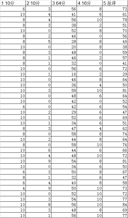 如上为其中1个班级,各分项成绩具体目录,需要统计学生人数超过110人,所有统计时间较长,进度较慢,在批阅第一个星期,常有学生来问成绩是否已经出来,并和我沟通遇到的难处,但我无能为力,并严重影响批阅进度,后更换地点进行报告批阅和成绩统计。