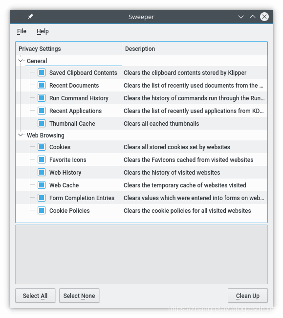 Sweeper是一个简单的KDE默认系统清理程序。它用于清除系统上不需要的用户活动痕迹以保护隐私,并通过删除未使用的临时文件来回收磁盘空间。它可以删除与Web相关的跟踪,如cookie,历史记录,缓存; 图像缩略图缓存,还清除应用程序和文档历史记录。