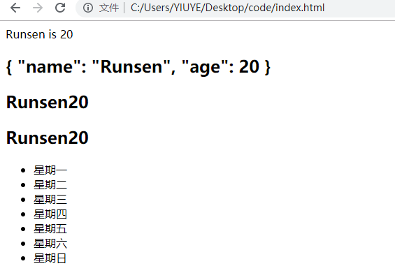 <script> var app = new Vue({ el:"#app", data:{ messsage:"Runsen is 20", person:{ name:"Runsen", age:20 }, week : ["星期一","星期二","星期三","星期四","星期五","星期六","星期日"] } })