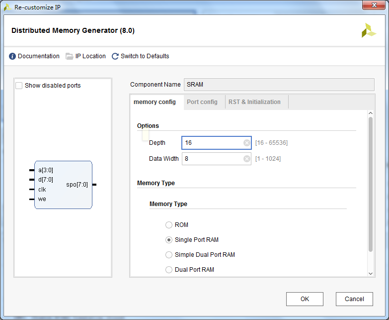 可以采用Distributed RAM以及Block RAM生成,这里采用Distributed RAM生成: