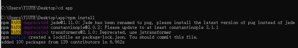 C:\Users\YIUYE\Desktop>express app warning: the default view engine will not be jade in future releases
