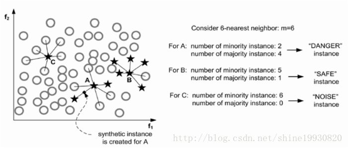 则将样本xi加入DANGER集合,显然DANGER集合代表了接近分类边界的样本,将DANGER当作SMOTE种子样本的输入生成新样本。特别地,当上述条件取右边界,即k近邻中全部样本都是多数类时此样本不会被选择为种样本生成新样本,此情况下的样本为噪音。