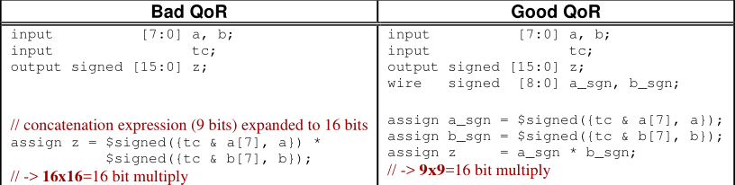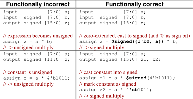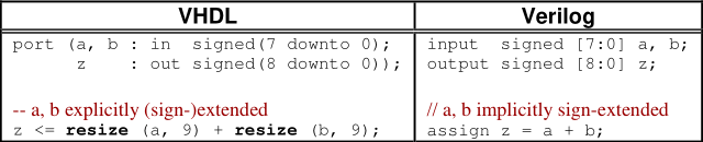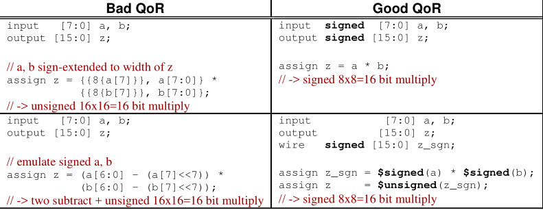 • Rule: Use type 'signed' (VHDL, Verilog 2001) for signed/2's complement arithmetic (do not emulate signed arithmetic using unsigned operands/operations). Also, do not use the 'integer' type except for constant values.