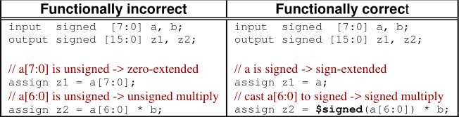 • Note: Part-select results are unsigned, regardless of the operands. Therefore, part-selects of signed vectors (for example, "a[6:0]" of "input signed [7:0] a") become unsigned, even if part-select specifies the entire vector (for example, "a[7:0]" of "input signed [7:0] a").
