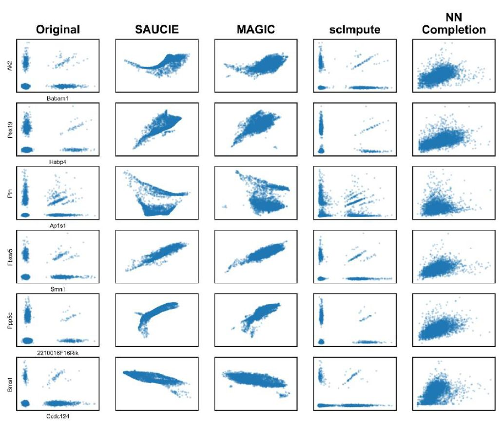 对于推断任务,使用10x mouse cortex数据集,与MAGIC、scImpute、nearest neighbors completion(NN Completion)模型进行对比,预测结果如图5。