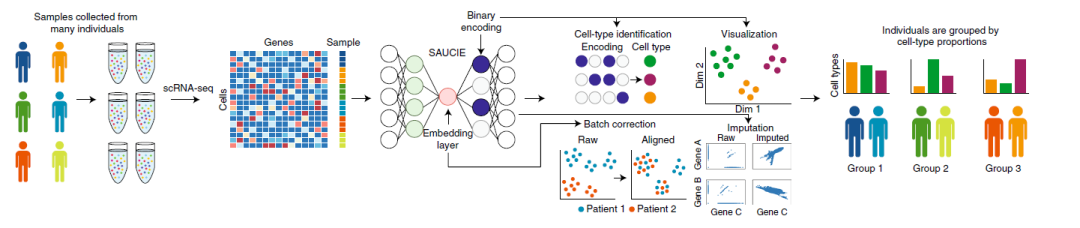 近年来,深度学习技术在处理生物医学数据方面的应用崭露头角,并取得不错的效果,这给大规模、高维度的单细胞数据分析处理带来了希望;2019年10月,耶鲁大学Smita Krishnaswamy课题组提出多任务神经网络框架SAUCIE,在来自40个科属180个样本的1.1千万的细胞群数据集上执行批量校正(不同批次实验数据去噪)、推断(预测细胞中的两个基因之间关系)、聚类、降维可视化四个任务,相比于对应的单任务学习主流方法表现出更好的效果。