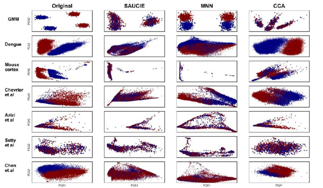 对于分批处理校正任务,使用人工数据集GMM、the dengue dataset、mouse cortex data、Chevrier et al、 Azizi et al and Setty et al数据集,与mutual nearest neighbors(MNN)、canonical correlation analysis(CCA)模型进行对比,实验结果如图3。