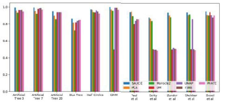 对于可视化任务,使用Artificially generated trees 3, Artificially generated trees 7,Artificially generated trees 20,random tree generated with diffusion limited aggregation (DLA), intersecting half circles, GMM, scRNA-seq hematopoiesis from Paul et al, CyTOF T cell development from Setty et al, CyTOF ipsc from Zunder at al, scRNA-seq retinal bipolar cells from Shekhar et al, scRNAseq mouse cortex from Zeisel et al数据集与PCA、Monocle2 diffusion maps、UMAP、tSNE、PHATE模型进行对比,precision-recall指标结果如图4。
