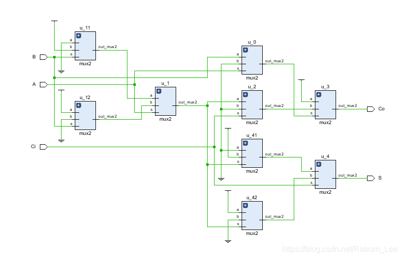 RTL图如下:可见,这个一位全加器都是由mux2构成的呀。