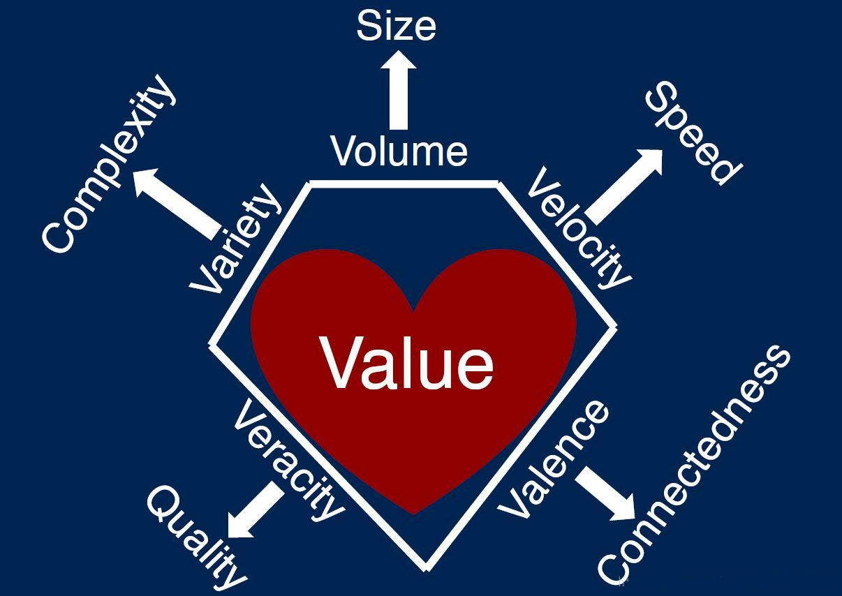 大数据有几个特性,最著名的是数据量(volume),速度(velocity),多样性(variety)。除此以外,还有就是准确性(veracity),连通性(valence), 和价值(value) 。