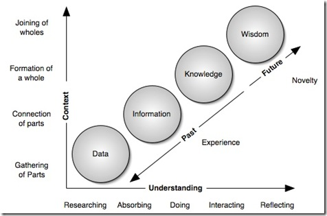| 离散、不相关的事实、文字、数字或符号 | 经过筛选、整理与分析的资料 | 结合个人能力与经验的信息,用于解决问题或创新知识 | 基于个人价值与信仰的前瞻性看法与想法。 |