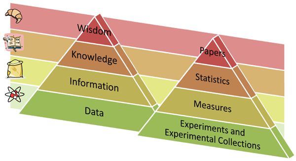 DIKW体系将数据、信息、知识、智慧纳入到一种金字塔形的层次体系,每一层比下一层都赋予的一些特质。原始观察及量度获得了数据、分析数据间的关系获得了信息。在行动上应用信息产生了知识。智慧关心未来,它含有暗示及滞后影响的意味。