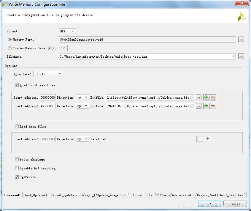 write_cfgmem -format mcs -size 128 -interface BPIx16 -loadbit "up 0x00000000 G:/Vivado_file/MultiBoot/MultiBoot.runs/impl_1/Golden_image.bit up 0x45000000 G:/Vivado_file/MultiBoot_Update/MultiBoot_Update.runs/impl_1/Update_image.bit " -file "C:/Users/Administrator/Desktop/multiboot_test.mcs"