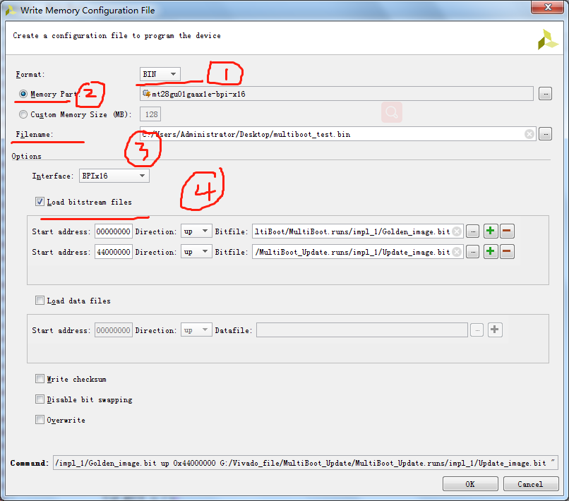 从上到下依次为1、2、3、4,1选择需要产生的配置文件的格式,2选择自己的Flash类型,3选择生成的文件的位置,4选择需要加载的比特流。