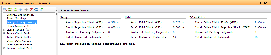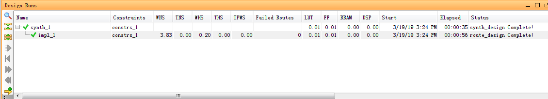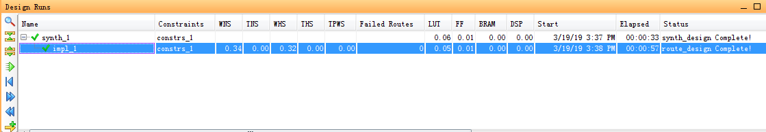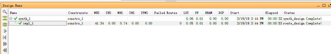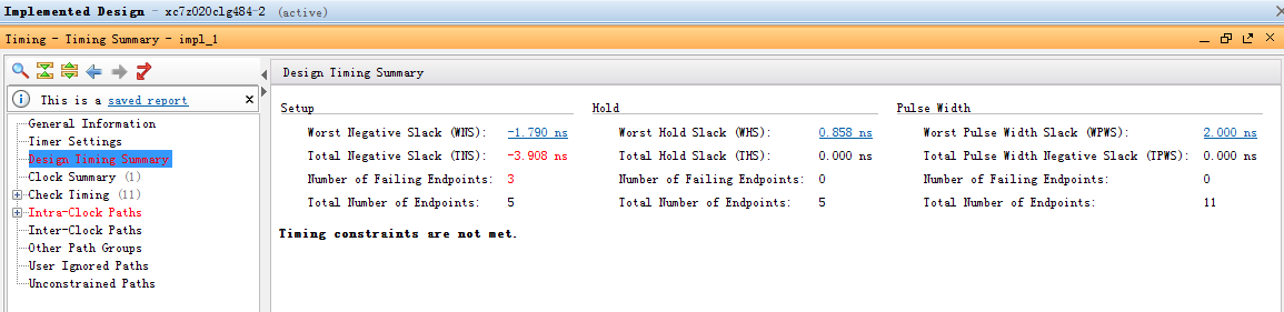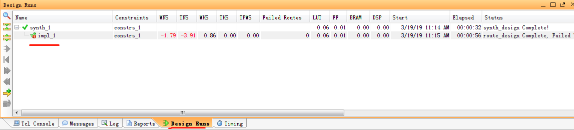 在Design Runs状态栏里,看到impl_1前面有一个感叹号,这就表示布线的时序不通过。