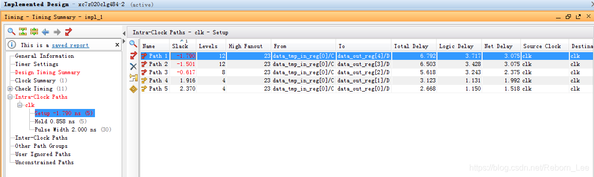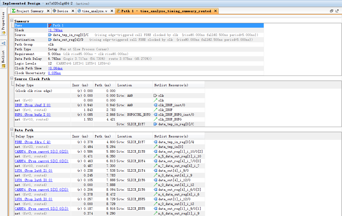 数据到达时间太长,易知是逻辑延迟以及布线延迟等引起,下面我们提供几种方案解决本例中的时序不满足问题。