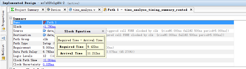 由以上信息可知,建立时间不满足,以路径1为例,裕量为-1.790ns。单击-1.790可见,弹出对话框表示,这条路径需要数据在9.422ns到达第二个触发器的输入,但实际消耗了11.212ns,导致建立时间不足。