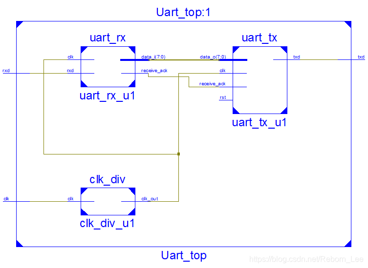 程序模块分为顶层Uart_top、发送模块uart_tx、接收模块uart_rx以及时钟产生模块clk_div。uart_rx将收到的包解析出8位数据,再传送给uart_tx发出,形成回环。参考时钟为100Mhz,波特率为9600bps。例子使用最简单的串口设置,没有校验位。