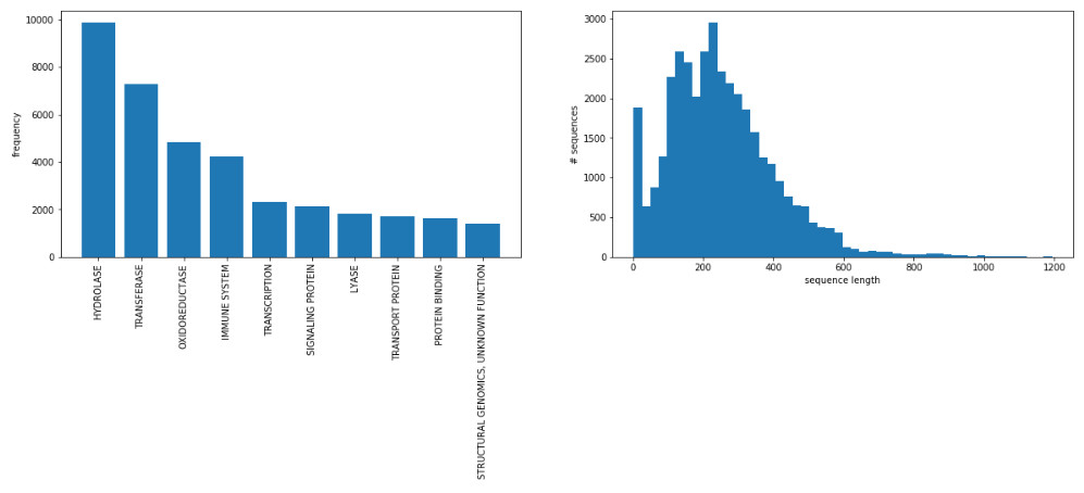 首先,数据集被简化为十个最常见类之一的样本。 序列的长度范围从极少数氨基酸到几千个氨基酸。