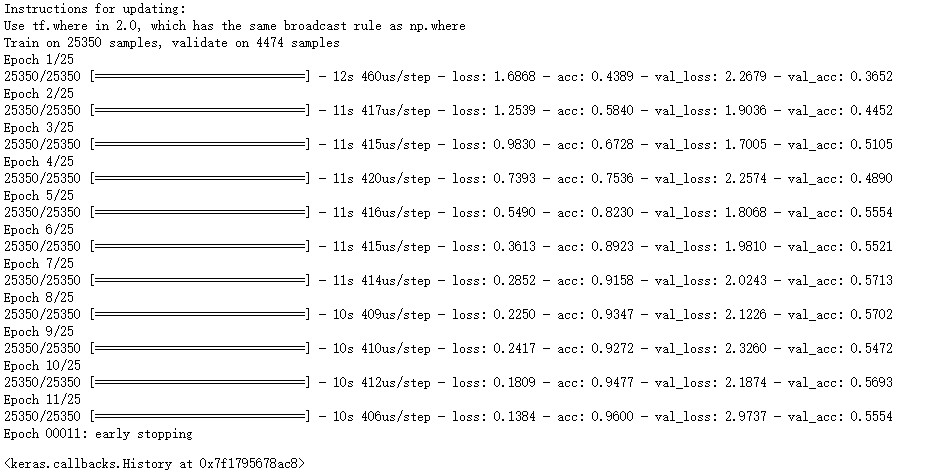 model.fit(X_train, y_train,  batch_size=128, verbose=1, validation_split=0.15,callbacks=[es],epochs=25) # epochs=15, # batch_size=128