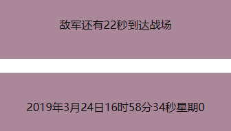 <body> <div id="box"> 敌军还有<span id="time">30</span>秒到达战场 </div> <div id="wrap"></div> <script> var oBox = document.getElementById("box"); var oWrap = document.getElementById("wrap"); var oTime = document.getElementById("time"); var timer; var num = 30; timer = setInterval(function () { num --; oTime.innerHTML = num; if(num === 0){ clearInterval(timer); oBox.innerHTML = "<p>打死他</p>"; } },1000); function change() { var data = new Date(); var year = data.getFullYear(); var mon = data.getMonth()+1; var date = data.getDate(); var hour = data.getHours(); var min = data.getMinutes(); var sec = data.getSeconds(); var day = data.getDay(); hour = toTwo(hour); min = toTwo(min); sec = toTwo(sec); function toTwo(n) { if(n< 10){//0123456789 n ="0" + n;//00 01 ----09 } return n; } oWrap.innerHTML = year + "年" + mon + "月" + date + "日" + hour + "时" + min + "分" + sec + "秒"+ "星期"+ day; } change(); setInterval(change,1000); </script>
