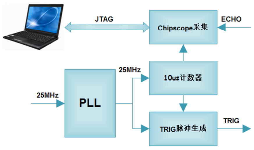 如上图,回波信号echo作为输入信号输入到FPGA的Chipscope进行采集,来查看echo信号的长度,由此来得出测量距离。