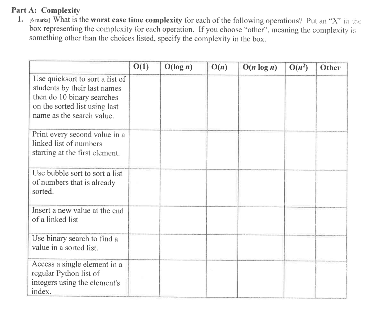 第一题很明显就是一个时间复杂度的题目,一个快速排序,一个链表查找,一个冒泡排序,一个链表插入,一个二叉搜索,一个访问Python列表中的单个元素。