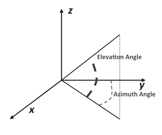 天线波束模式表示信号的功率或幅度随角度的变化。 这里,角度用方位角( azimuth angle )和俯仰角(elevation angle)表示。 方位角是通过在水平平面中设置参考方向(例如,北)来定义的角度(例如,平行于地球的平面),并且仰角是相对于线定义的角度。 垂直于这个水平面。 这些角度下图所示。 天线波束模式通常是天线形状,尺寸和频率的函数。