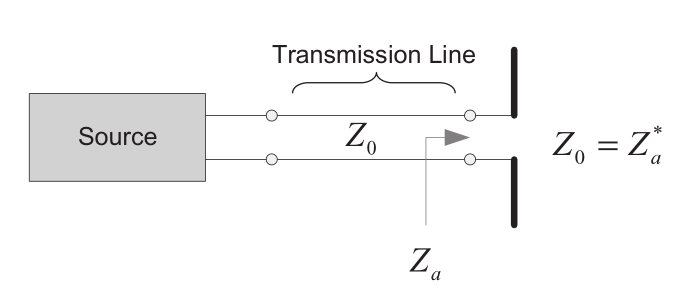 在发射机端,天线连接到信号源,如图9.5所示。 将天线阻抗与信号源匹配非常重要,以便实现从信号源到天线的最大功率传输。 通常通过天线端子(Z a)看到阻抗。 在图9.5中,Z 0指的是传输线(例如,连接电缆)的特征阻抗。