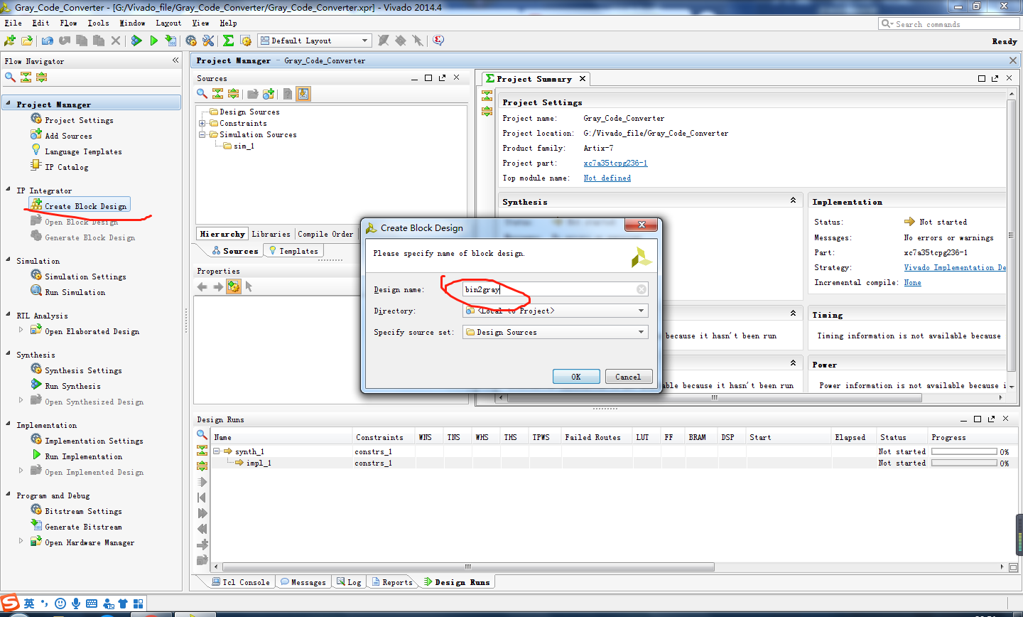 打开Vivado,创建名为Gray_Code_converter的工程,创建原理图,添加IP,进行原理图设计。