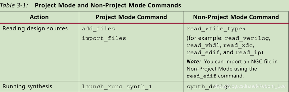 与为您管理源文件的项目模式不同,源文件在非项目模式下由您控制。 使用Tcl命令,指定要处理和输出要生成的文件的文件,包括网表,比特流和报告文件。 项目模式和非项目模式命令显示常用的项目模式命令和相应的非项目模式命令。