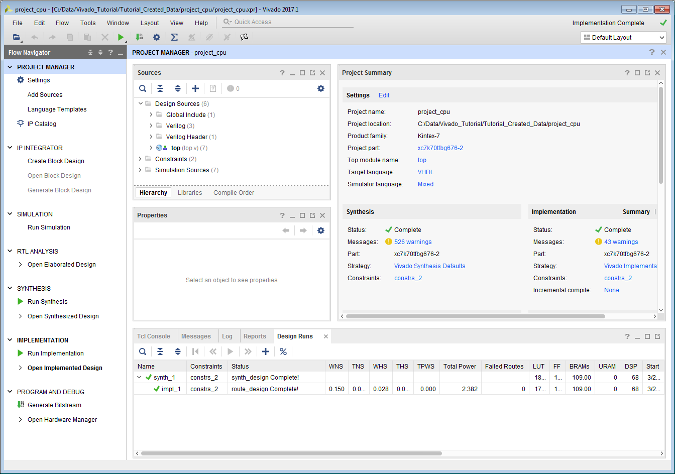 完成设计任务后,您可以打开生成的设计来分析结果并应用约束。 在Flow Navigator中,单击Open Elaborated Design,Open Synthesized Design或Open Implemented Design。
