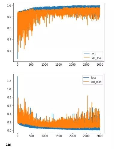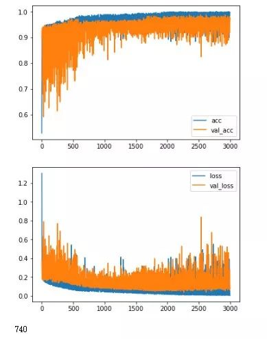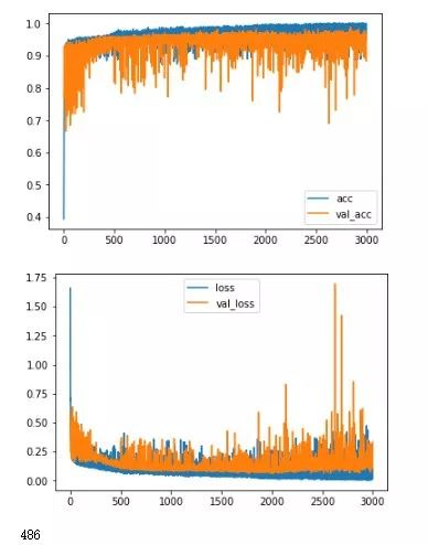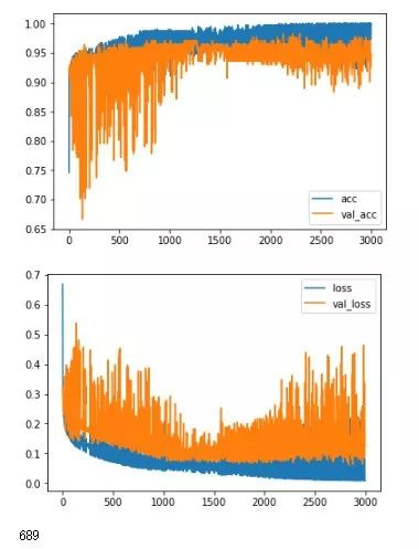 history01 = model2.fit(mat[:,1:],mat[:,0], validation_split=0.3,shuffle=False,epochs=3000, batch_size=128,verbose=0)