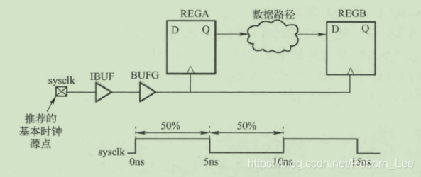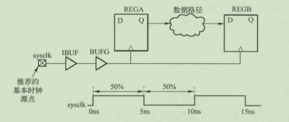 在这个例子中,通过名字为“sysclk”的端口,将PCB上的时钟引入FPGA元器件中,并且通过输入缓冲器和一个时钟缓冲器,最终到达路径上的寄存器。该时钟的属性为:周期为10ns,占空比为50%,无相移。