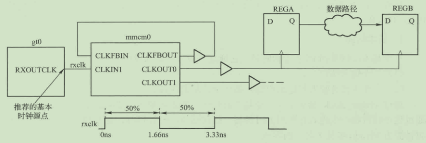 一个收发器gt0用于从PCB的一个高速链路中恢复时钟rxclk,该时钟属性为:周期为3.33ns,占空比为50%,该时钟连接mmcm0,该模块生成一些补偿后的时钟,用于设计。