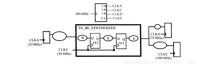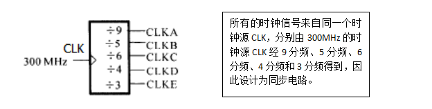 我们要综合的模块的时钟是CLKC,但是前后模块的时钟不一定是CLKC,但是前后模块的时钟跟CLKC是来源于同一个时钟的,比如说经过锁相环分频或者倍频,这里拿分频来举例,比如说CLKA、 CLKB、CLKC、CLKD、CLKE都是由同一个时钟CLK经过分频得来,如下图所示: