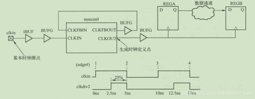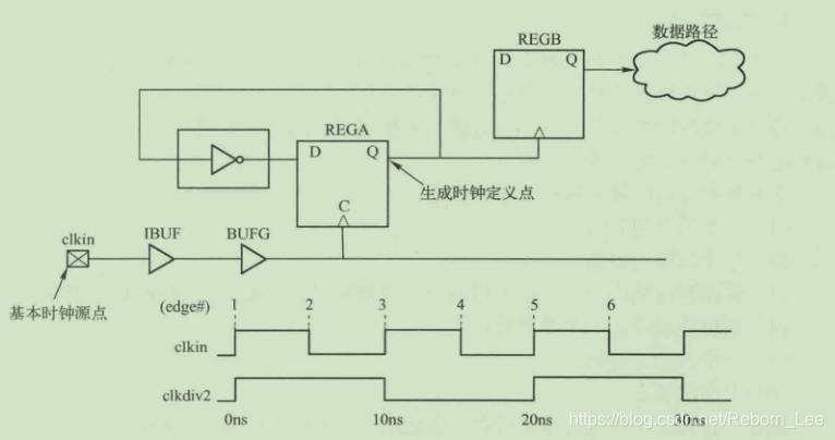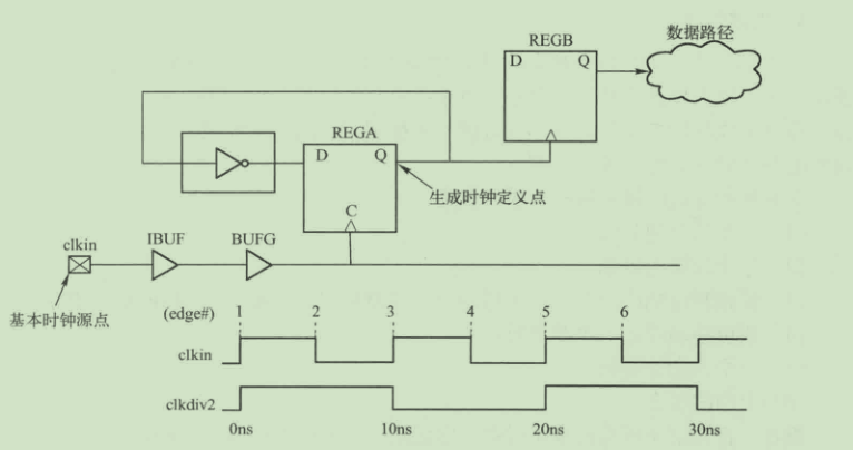 如下图给出一个生成时钟的例子:该例中基本时钟的周期是10ns,通过REGA进行二分频,该分频时钟驱动另一个寄存器的时钟引脚。相应的,将生成的时钟称为clkdiv2.