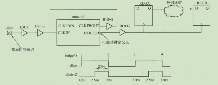 clkin是主时钟,其属性可以表示为:周期为10ns,占空比为50%。该时钟最终连接mmcm0模块,由该模块产生一个时钟,其属性表示为:占空比为25%,相移为90°。这个生成时钟参照主时钟沿1、2和3定义,这些沿发生在0ns,5ns,和10ns。为了得到希望的波形,将第一个和第三个沿移动2.5ns。