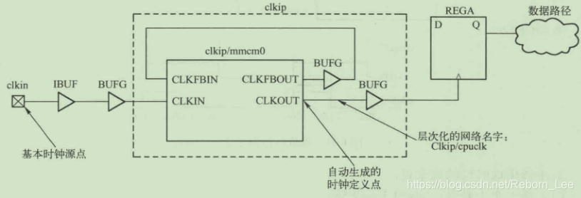 该例子说明了由MMCM生成的时钟。在该例子中,主时钟clkin驱动clkip/mmcm0的CLKIN输入。自动生成的时钟名字是“cpuclk”,它的定义点是“clkip/mmcm0/CLKOUT”。