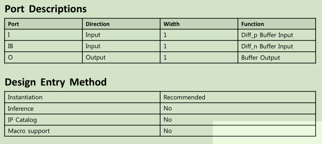 该设计元素是一个支持低电压差分信号的输入缓冲器。 在IBUFDS中,设计级接口信号表示为两个不同的端口(I和IB),一个视为“主”,另一个视为“从”。 主机和从机是相同逻辑信号的相位相反(例如,MYNET_P和MYNET_N)。 可选的,可编程差分端接功能可用于帮助改善信号完整性并减少外部元件。