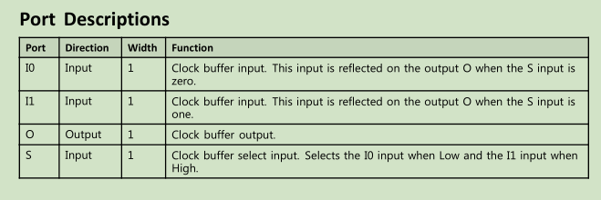 该设计元素是一个全局时钟缓冲器,可以在两个输入时钟之间进行选择:I0和I1。 当选择输入(S)为低时,选择I0上的信号作为输出(O)。 当选择输入(S)为高电平时,选择I1上的信号进行输出。