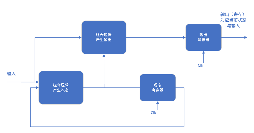 上上图可以看出,对于Mealy 1型状态机来说,由于次态和输出均由现态和输入通过组合逻辑共同决定,因此可以将状态转移部分和输出生成部分合并成一个部分,兼并产生状态机的次态和输出。