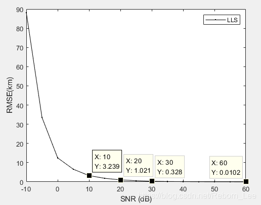 从下图的定位误差分析图中可以看出,信噪比为20dB时候的定位误差达到了1km之多,信噪比为30dB时候的定位误差为328m,这与之前的非线性方法相比,定位误差就大了一些,当然我们也能理解,毕竟做了一些线性近似嘛。