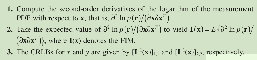 生成CRLB的关键是构造相应的Fisher信息矩阵(FIM)。 FIM逆的对角元素是可实现的最小方差值。 考虑公式2.1的一般测量模型,使用以下步骤总结计算CRLB的标准程序:
