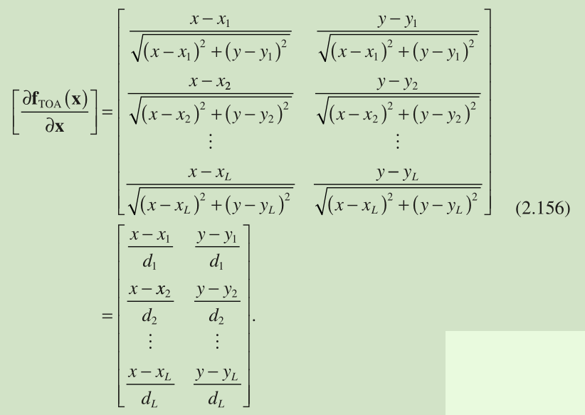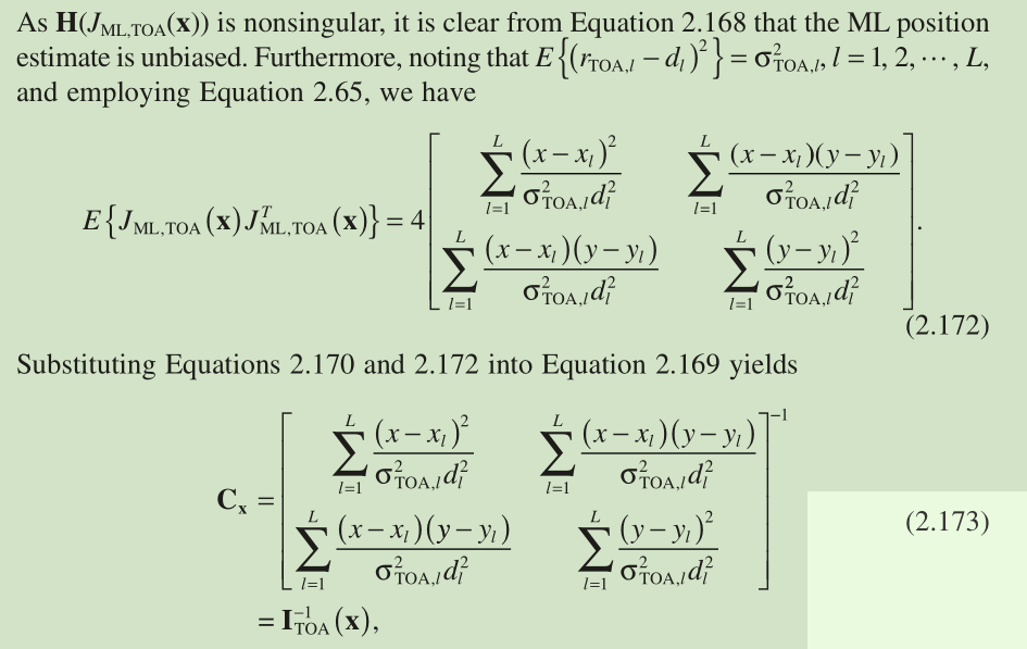 where C denotes the covariance matrix for n . We now utilize Equation 2.154 to determine the FIMs for positioning with TOA measure -ments based on Equations 2.8 and their associated noise covariance matrices, respectively. The FIM based on TOA measurements of Equation 2.5 , denoted by