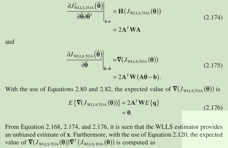 均值和方差表达式也可以应用于线性方法,其对应于二次成本函数的最小化。 考虑公式2.119中的WLLS成本函数,相应的Hessian矩阵和梯度向量确定为