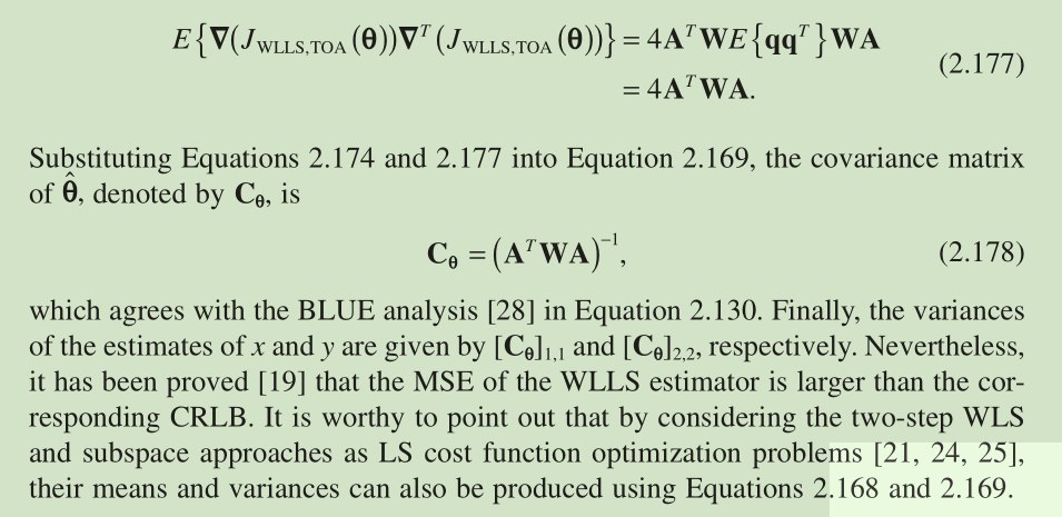 CRLB给出了使用相同数据的任何无偏估计可获得的方差的下界,因此它可以作为与定位算法的均方误差(MSE)进行比较的重要基准。 然而,有偏估计的MSE可能小于CRLB。