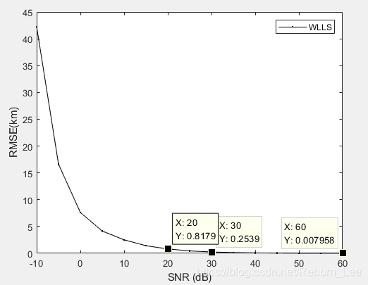 从下图的定位误差分析图中可以看出,信噪比为20dB时候的定位误差达到了817m,信噪比为30dB时候的定位误差为253m,这与之前的非线性方法相比,定位误差不相上下,但是与lls方法相比,定位误差小了一些,说明WLLS算法确实定位准确呀。