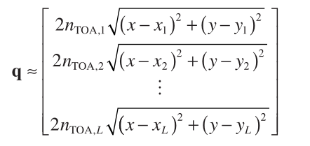 LLS方法试图将方程(1)重组为x中的线性方程,然后使用普通LS技术估计位置。 对于 TOA 测量,我们必须引入一个中间变量,它是线性化过程中源位置的函数。 基于 TOA 信息的LLS位置估计器如下。