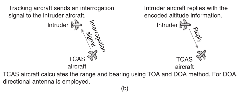该警告信号独立于空中交通管制(ATC)[19]提供给飞行员。 它由两部分组成:询问器和转发器。 每架飞机都配备了两个部件。 一架飞机上的询问器询问其他飞机上的转发器并分析这些回复以确定入侵飞机的航程,方位和相对高度(如果报告)(见图1.4b)。